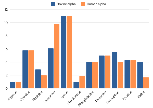 Also known as alpha, alpha-lac, or lactalbumin, alpha-lactalbumin is one of the main protein fractions naturally occurring in milk. Alpha is the most prominent protein fraction in human milk and second most prominent fraction in bovine milk. It is naturally high in the essential amino acid tryptophan, and the sulphur amino-acid, cysteine.