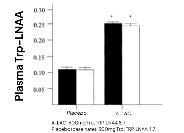 As little as 500mg has been shown to enhance the plasma TRP:LNAA levels by 48% against placebo, in both low- and high-stress vulnerable subjects (figure 6 – Markus et al, 2000).