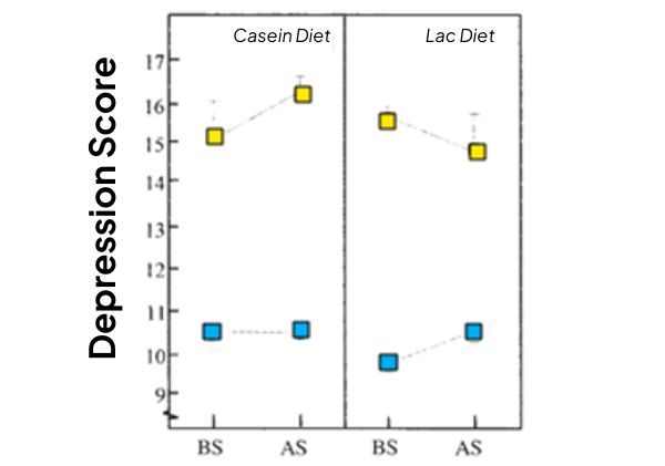 Change in depression scores before(BS) and after stress (AS) tests in high stress vulnerable and low stress vulnerable subjects. Split into casein and alpha-lac diet