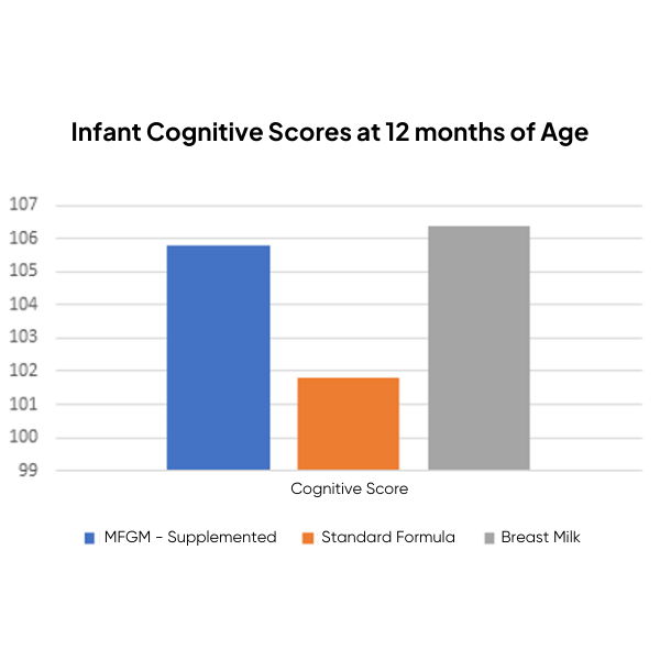 Infants fed MFGM-supplemented formula from 2 months to 6 months of age performed significantly better in cognitive tests at 12m than infants fed standard formula. MFGM-supplemented infants did not differ from breastfed infants. This indicates that supplementing formula with MFGM really does allow a closer match to the benefits of breastmilk.