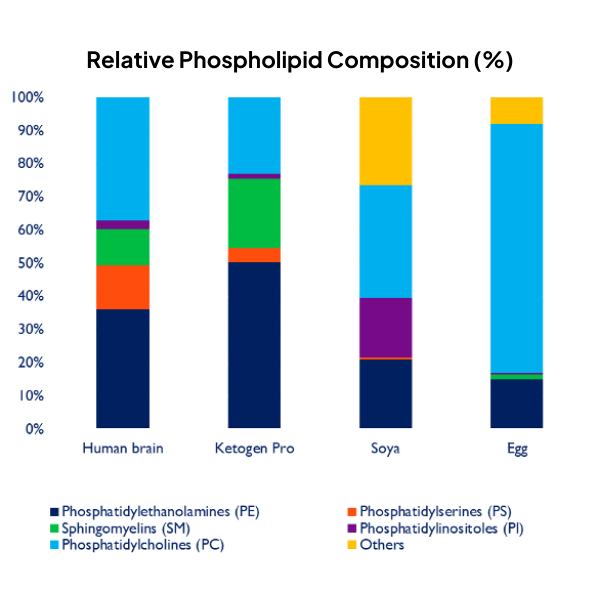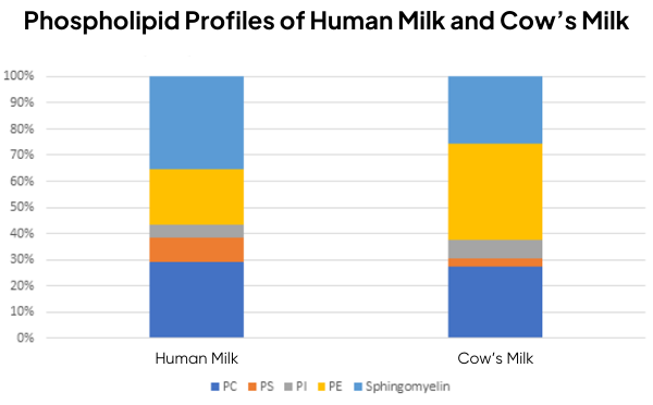Phospholipids are a key component of the brain and important for normal brain development and functioning. The phospholipid profile of MFGM is like that of the human brain (see figure below). There is some limited literature showing a benefit of these phospholipids on working memory, cognitive performance, and stress management in adults.